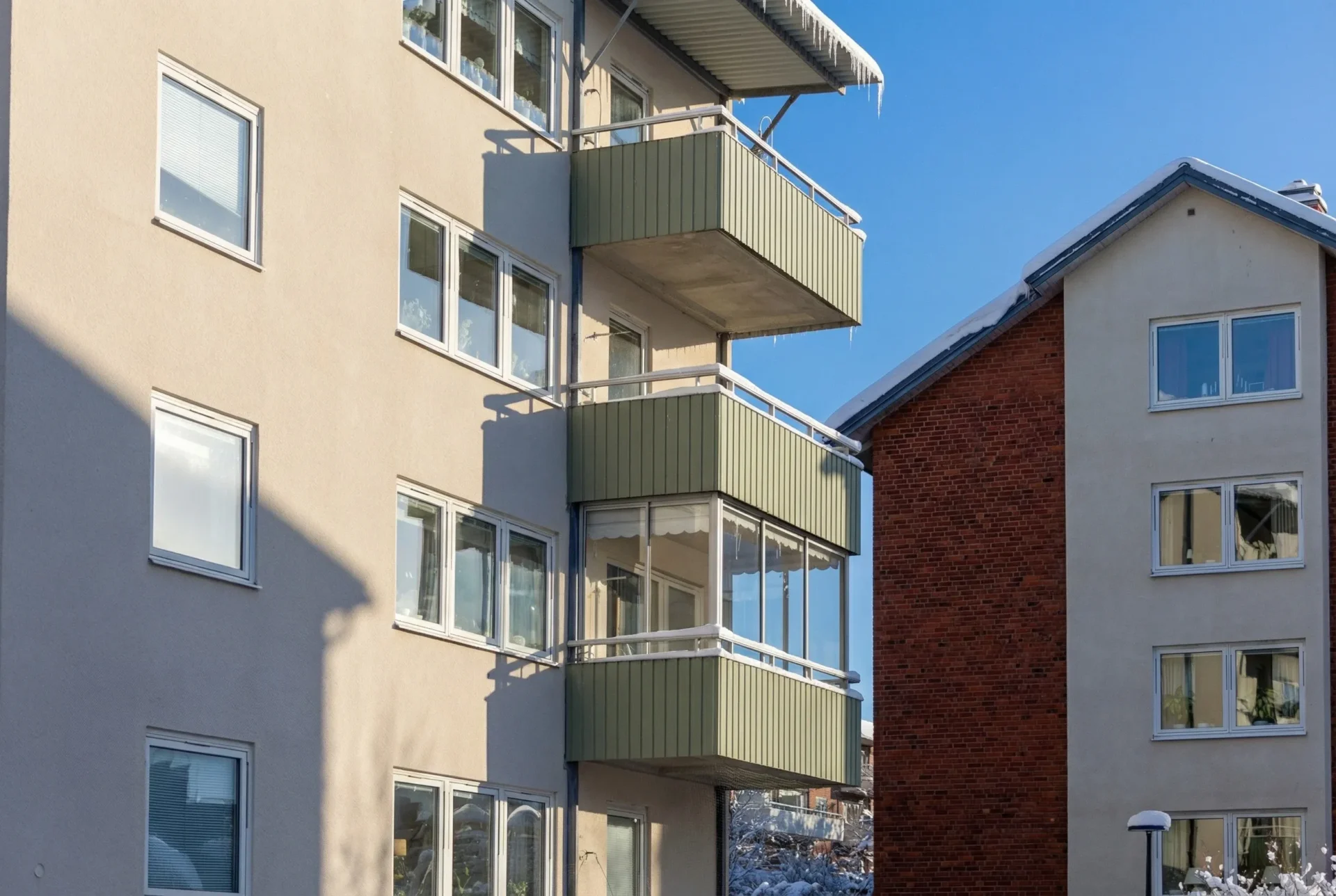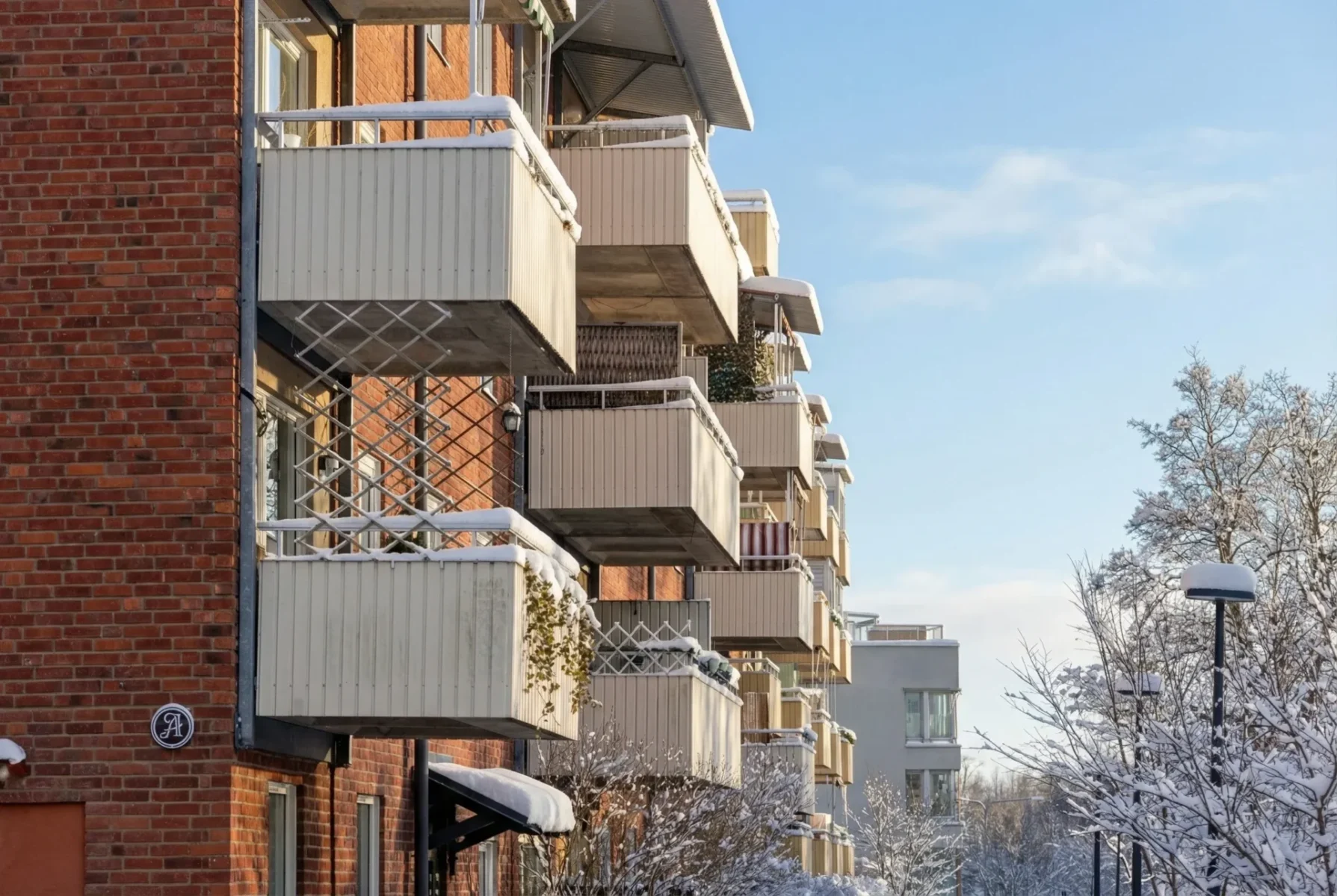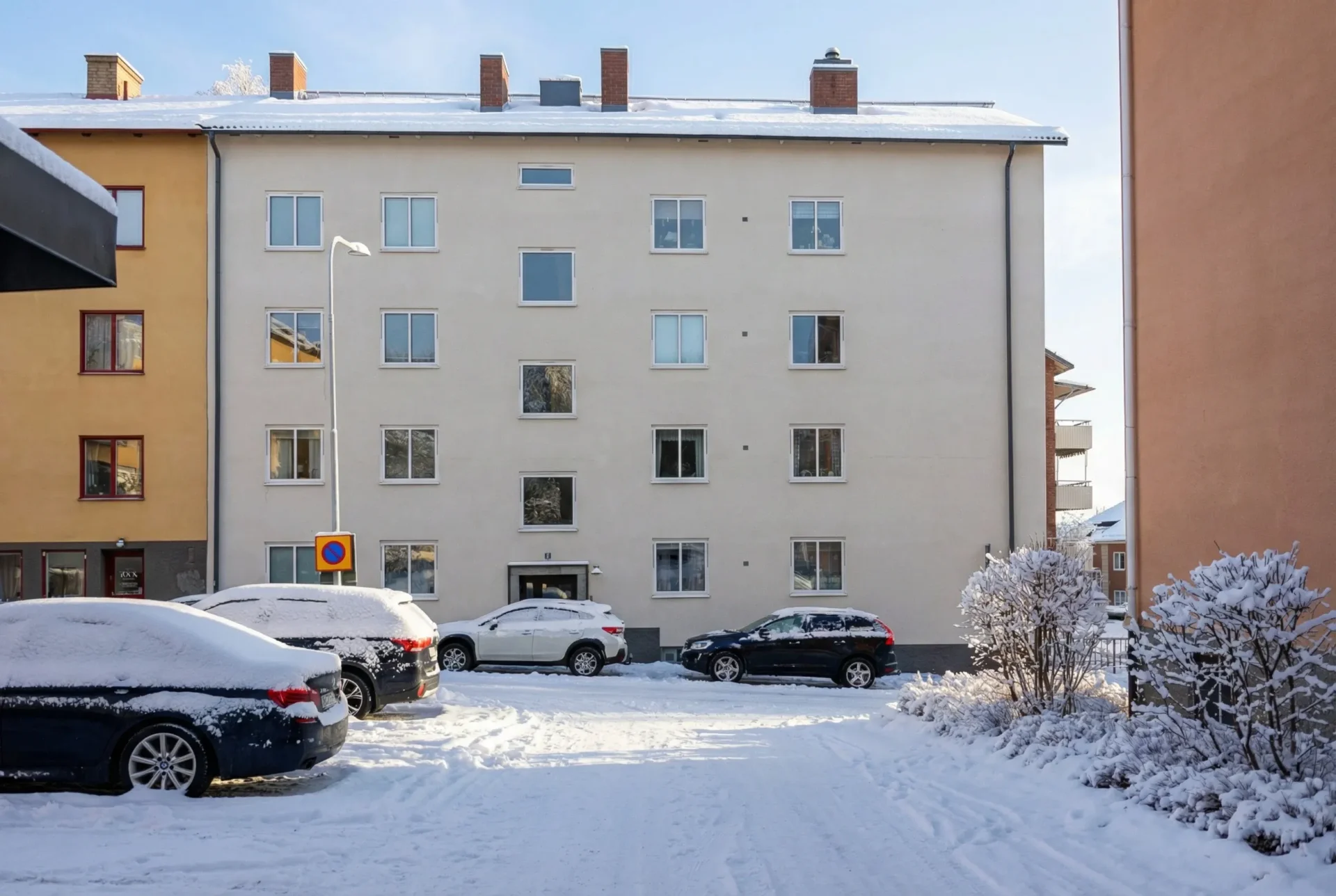 Balkonger som vetter mot Svartån, samt mot gården med vy mot Västerås DomkyrkaParkering