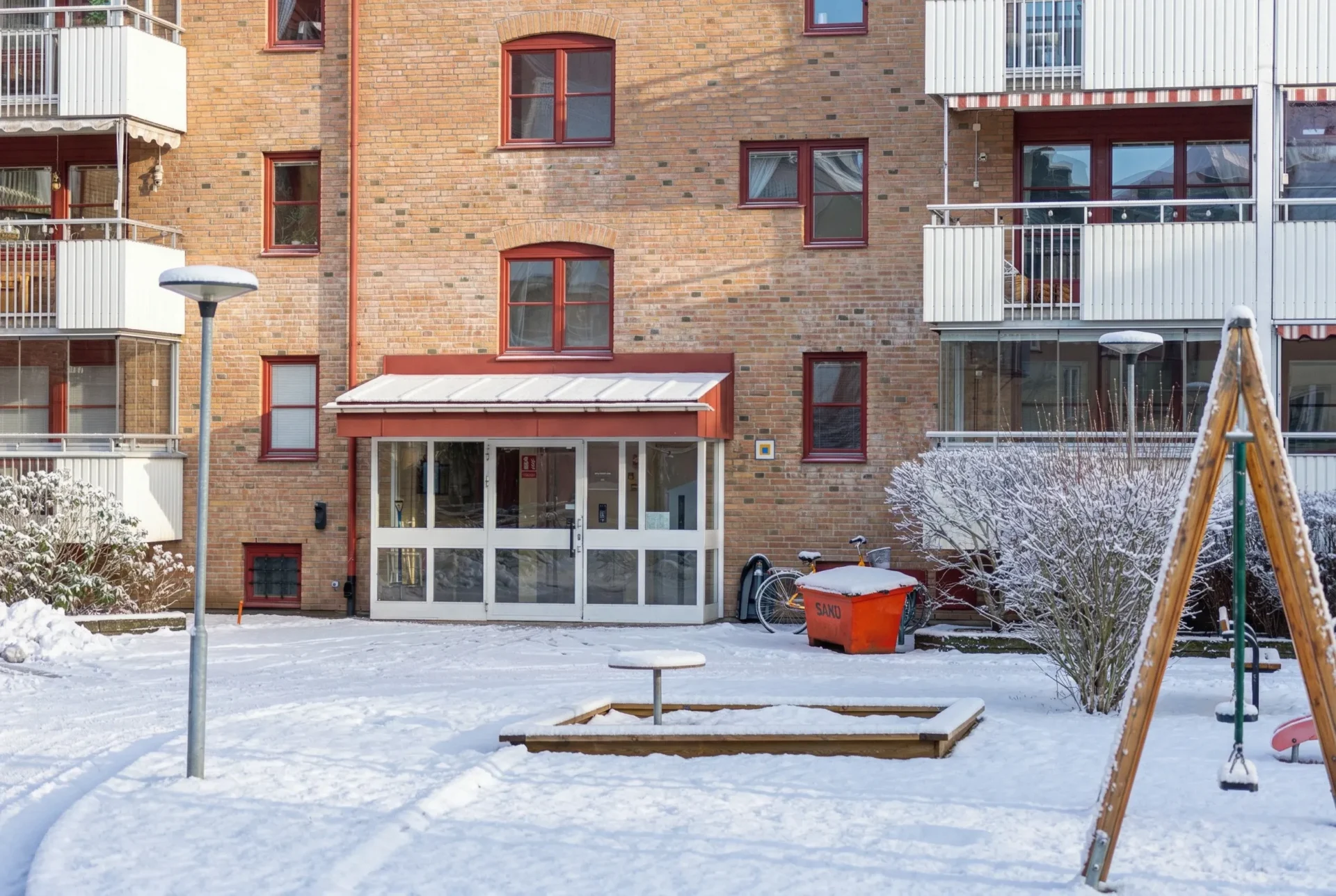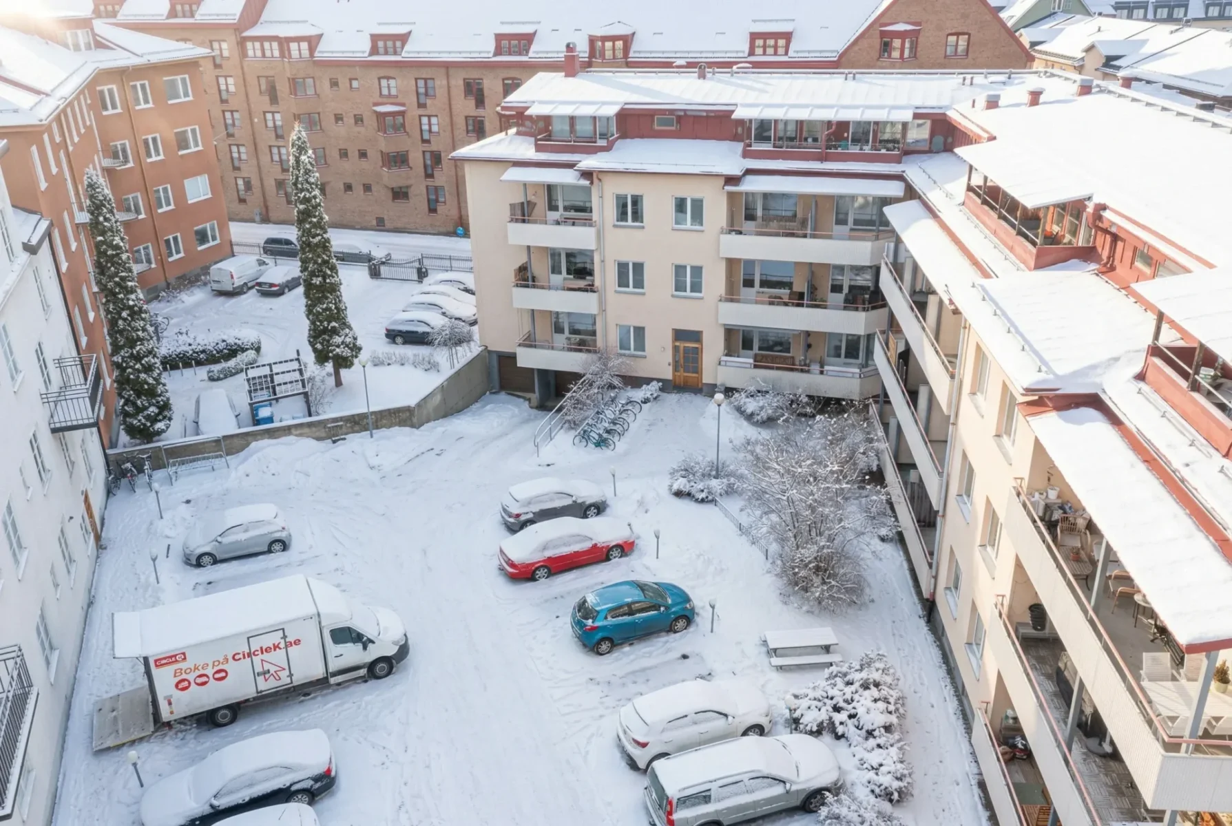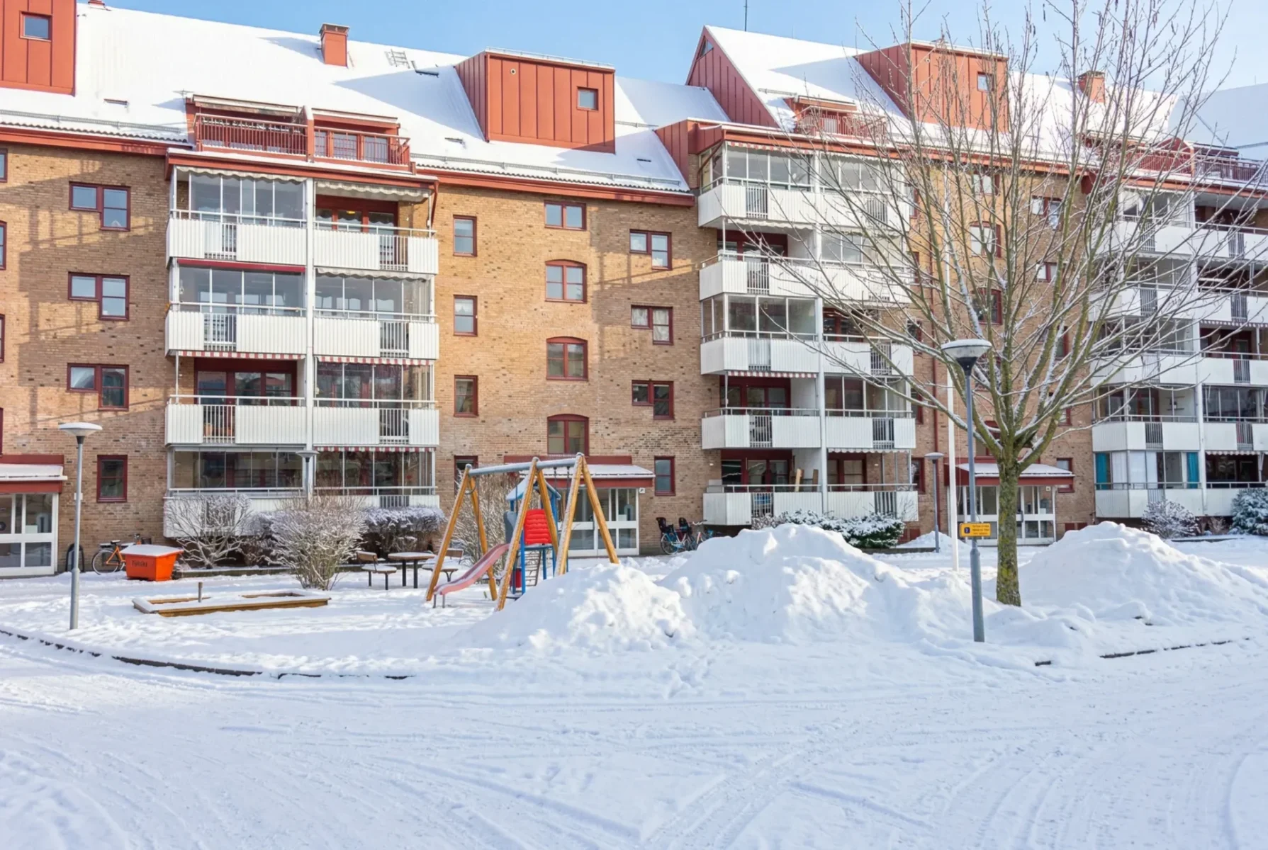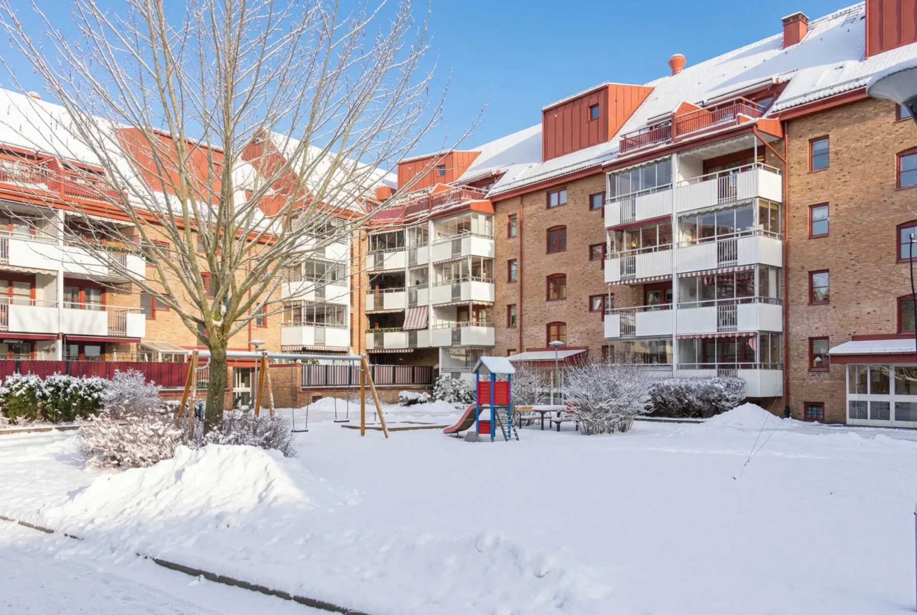 Balkonger finns till nästan alla lägenheternaGård